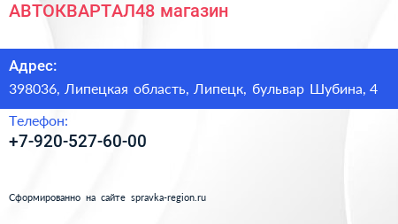 АВТОКВАРТАЛ48, магазин по адресу 398036, Липецкая область, Липецк, бульвар Шубина, 4 в дальнейшем Организация, размещена в следующих категориях: