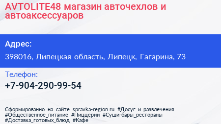 AVTOLITE48, магазин авточехлов и автоаксессуаров по адресу 398016, Липецкая область, Липецк, Гагарина, 73 в дальнейшем Организация, размещена в следующих категориях: