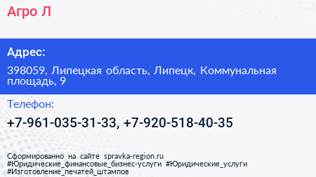 Агро-Л по адресу 398059, Липецкая область, Липецк, Коммунальная площадь, 9 в дальнейшем Организация, размещена в следующих категориях: