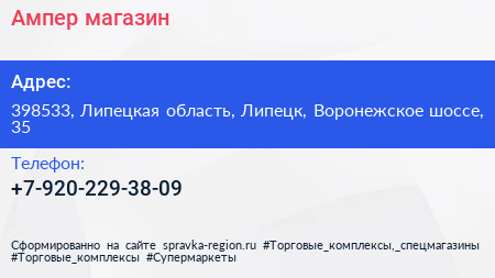 Ампер, магазин по адресу 398533, Липецкая область, Липецк, Воронежское шоссе, 35 в дальнейшем Организация, размещена в следующих категориях: