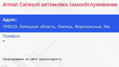 Arman Carwash, автомойка самообслуживания по адресу 398533, Липецкая область, Липецк, Воронежская, 36а в дальнейшем Организация, размещена в следующих категориях: