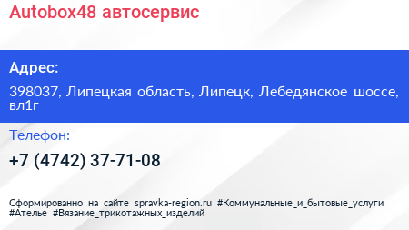 Autobox48, автосервис по адресу 398037, Липецкая область, Липецк, Лебедянское шоссе, вл1г в дальнейшем Организация, размещена в следующих категориях: