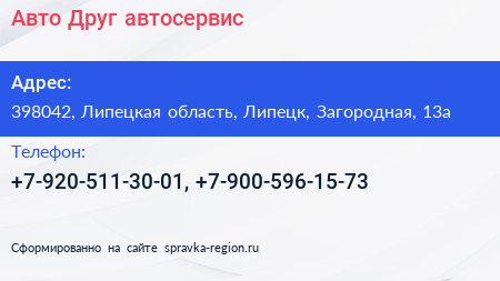 Авто Друг, автосервис по адресу 398042, Липецкая область, Липецк, Загородная, 13а в дальнейшем Организация, размещена в следующих категориях: