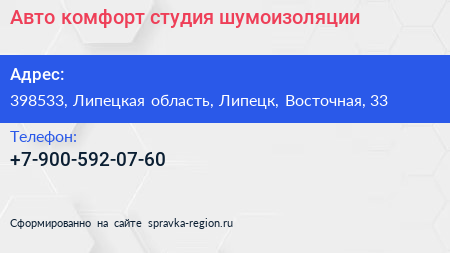 Авто-комфорт, студия шумоизоляции по адресу 398533, Липецкая область, Липецк, Восточная, 33 в дальнейшем Организация, размещена в следующих категориях: