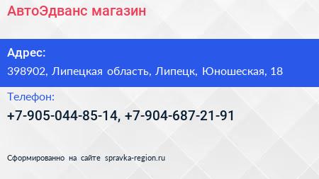 АвтоЭдванс, магазин по адресу 398902, Липецкая область, Липецк, Юношеская, 18 в дальнейшем Организация, размещена в следующих категориях:
