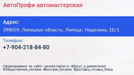 АвтоПрофи, автомастерская по адресу 398059, Липецкая область, Липецк, Неделина, 1Б/1 в дальнейшем Организация, размещена в следующих категориях:
