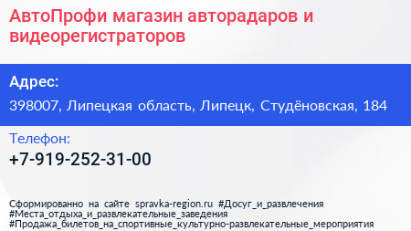 АвтоПрофи, магазин авторадаров и видеорегистраторов по адресу 398007, Липецкая область, Липецк, Студёновская, 184 в дальнейшем Организация, размещена в следующих категориях: