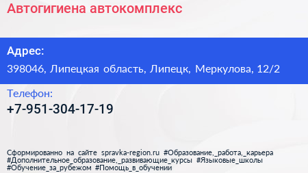 Автогигиена, автокомплекс по адресу 398046, Липецкая область, Липецк, Меркулова, 12/2 в дальнейшем Организация, размещена в следующих категориях: