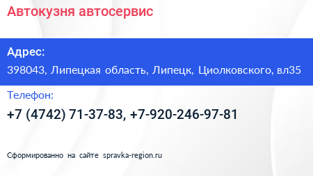 Автокузня, автосервис по адресу 398043, Липецкая область, Липецк, Циолковского, вл35 в дальнейшем Организация, размещена в следующих категориях: