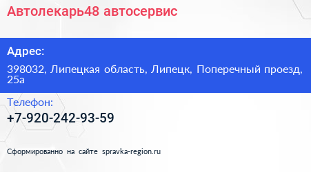 Автолекарь48, автосервис по адресу 398032, Липецкая область, Липецк, Поперечный проезд, 25а в дальнейшем Организация, размещена в следующих категориях: