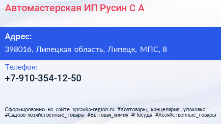 Автомастерская, ИП Русин С.А. по адресу 398016, Липецкая область, Липецк, МПС, 8 в дальнейшем Организация, размещена в следующих категориях: