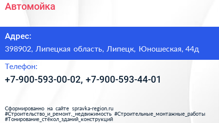 Автомойка по адресу 398902, Липецкая область, Липецк, Юношеская, 44д в дальнейшем Организация, размещена в следующих категориях: