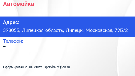 Автомойка по адресу 398055, Липецкая область, Липецк, Московская, 79Б/2 в дальнейшем Организация, размещена в следующих категориях: