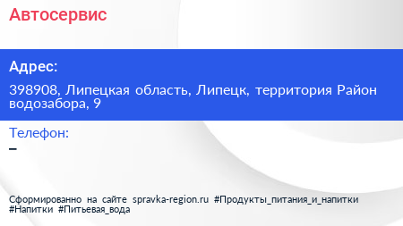 Автосервис по адресу 398908, Липецкая область, Липецк, территория Район водозабора, 9 в дальнейшем Организация, размещена в следующих категориях: