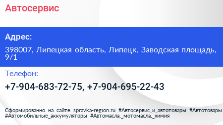 Автосервис по адресу 398007, Липецкая область, Липецк, Заводская площадь, 9/1 в дальнейшем Организация, размещена в следующих категориях: