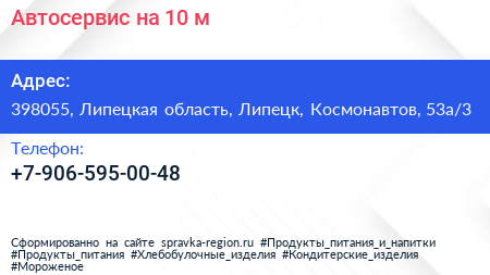 Автосервис на 10-м по адресу 398055, Липецкая область, Липецк, Космонавтов, 53а/3 в дальнейшем Организация, размещена в следующих категориях: