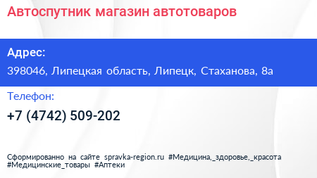 Автоспутник, магазин автотоваров по адресу 398046, Липецкая область, Липецк, Стаханова, 8а в дальнейшем Организация, размещена в следующих категориях: