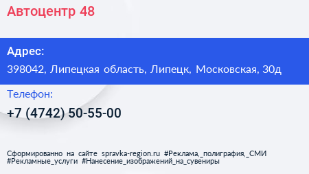 Автоцентр 48 по адресу 398042, Липецкая область, Липецк, Московская, 30д в дальнейшем Организация, размещена в следующих категориях: