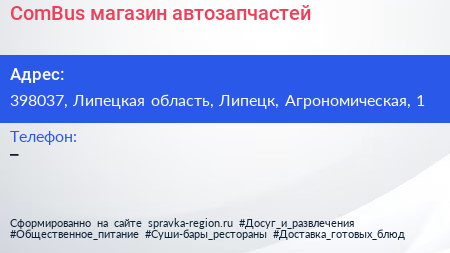 ComBus, магазин автозапчастей по адресу 398037, Липецкая область, Липецк, Агрономическая, 1 в дальнейшем Организация, размещена в следующих категориях: