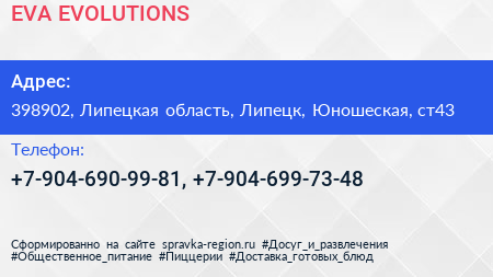 EVA-EVOLUTIONS по адресу 398902, Липецкая область, Липецк, Юношеская, ст43 в дальнейшем Организация, размещена в следующих категориях: