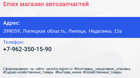 Emex, магазин автозапчастей по адресу 398059, Липецкая область, Липецк, Неделина, 15а в дальнейшем Организация, размещена в следующих категориях: