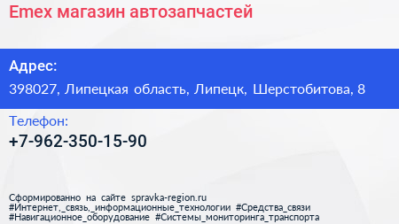 Emex, магазин автозапчастей по адресу 398027, Липецкая область, Липецк, Шерстобитова, 8 в дальнейшем Организация, размещена в следующих категориях: