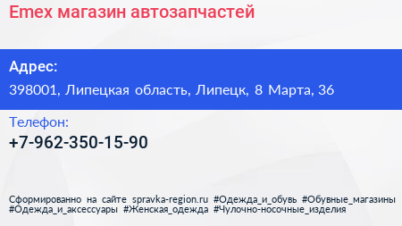 Emex, магазин автозапчастей по адресу 398001, Липецкая область, Липецк, 8 Марта, 36 в дальнейшем Организация, размещена в следующих категориях: