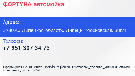 ФОРТУНА, автомойка по адресу 398070, Липецкая область, Липецк, Московская, 30г/1 в дальнейшем Организация, размещена в следующих категориях: