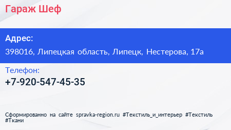 Гараж-Шеф по адресу 398016, Липецкая область, Липецк, Нестерова, 17а в дальнейшем Организация, размещена в следующих категориях: