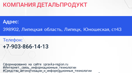 КОМПАНИЯ ДЕТАЛЬПРОДУКТ по адресу 398902, Липецкая область, Липецк, Юношеская, ст43 в дальнейшем Организация, размещена в следующих категориях:
