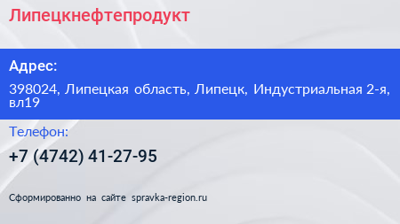 Липецкнефтепродукт по адресу 398024, Липецкая область, Липецк, Индустриальная 2-я, вл19 в дальнейшем Организация, размещена в следующих категориях: