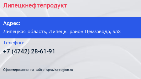 Липецкнефтепродукт по адресу Липецкая область, Липецк, район Цемзавода, вл3 в дальнейшем Организация, размещена в следующих категориях: