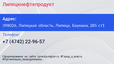 Липецкнефтепродукт по адресу 398026, Липецкая область, Липецк, Баумана, 285 ст1 в дальнейшем Организация, размещена в следующих категориях: