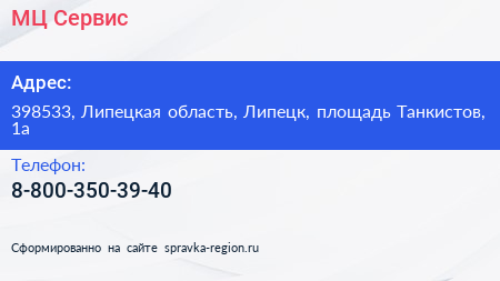 МЦ Сервис по адресу 398533, Липецкая область, Липецк, площадь Танкистов, 1а в дальнейшем Организация, размещена в следующих категориях: