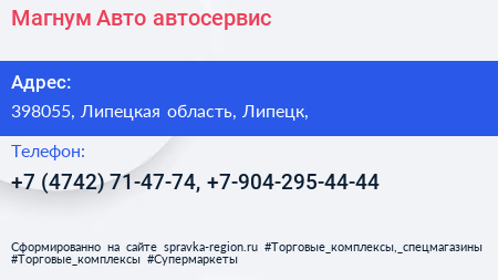 Магнум Авто, автосервис по адресу 398055, Липецкая область, Липецк, в дальнейшем Организация, размещена в следующих категориях: