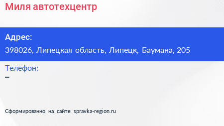 Миля, автотехцентр по адресу 398026, Липецкая область, Липецк, Баумана, 205 в дальнейшем Организация, размещена в следующих категориях: