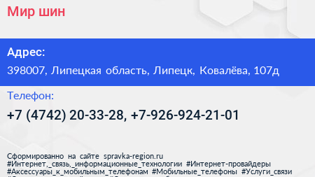 Мир шин по адресу 398007, Липецкая область, Липецк, Ковалёва, 107д в дальнейшем Организация, размещена в следующих категориях: