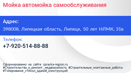 Мойка!, автомойка самообслуживания по адресу 398008, Липецкая область, Липецк, 50 лет НЛМК, 31в в дальнейшем Организация, размещена в следующих категориях: