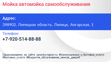 Мойка!, автомойка самообслуживания по адресу 398902, Липецкая область, Липецк, Ангарская, 1 в дальнейшем Организация, размещена в следующих категориях: