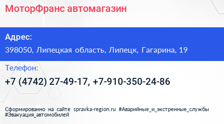 МоторФранс, автомагазин по адресу 398050, Липецкая область, Липецк, Гагарина, 19 в дальнейшем Организация, размещена в следующих категориях: