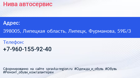 Нива, автосервис по адресу 398005, Липецкая область, Липецк, Фурманова, 59Б/3 в дальнейшем Организация, размещена в следующих категориях: