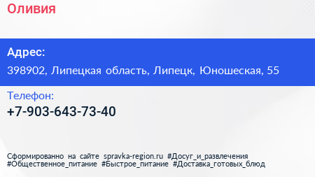 Оливия по адресу 398902, Липецкая область, Липецк, Юношеская, 55 в дальнейшем Организация, размещена в следующих категориях: