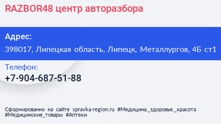 RAZBOR48, центр авторазбора по адресу 398017, Липецкая область, Липецк, Металлургов, 4Б ст1 в дальнейшем Организация, размещена в следующих категориях:
