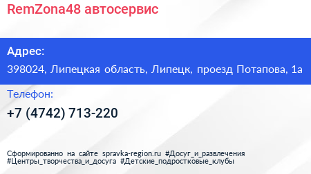 RemZona48, автосервис по адресу 398024, Липецкая область, Липецк, проезд Потапова, 1а в дальнейшем Организация, размещена в следующих категориях: