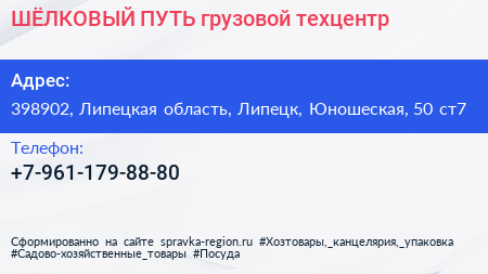 ШЁЛКОВЫЙ ПУТЬ, грузовой техцентр по адресу 398902, Липецкая область, Липецк, Юношеская, 50 ст7 в дальнейшем Организация, размещена в следующих категориях:
