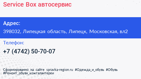 Service-Box, автосервис по адресу 398032, Липецкая область, Липецк, Московская, вл2 в дальнейшем Организация, размещена в следующих категориях: