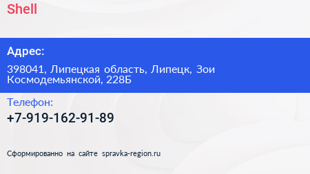 Shell по адресу 398041, Липецкая область, Липецк, Зои Космодемьянской, 228Б в дальнейшем Организация, размещена в следующих категориях: