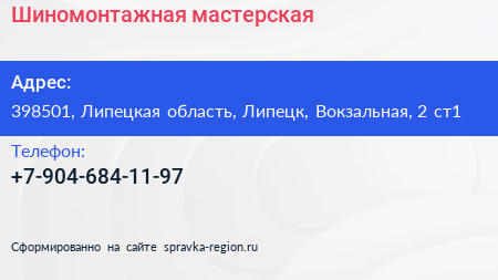 Шиномонтажная мастерская по адресу 398501, Липецкая область, Липецк, Вокзальная, 2 ст1 в дальнейшем Организация, размещена в следующих категориях: