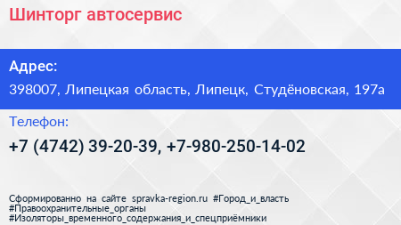 Шинторг, автосервис по адресу 398007, Липецкая область, Липецк, Студёновская, 197а в дальнейшем Организация, размещена в следующих категориях:
