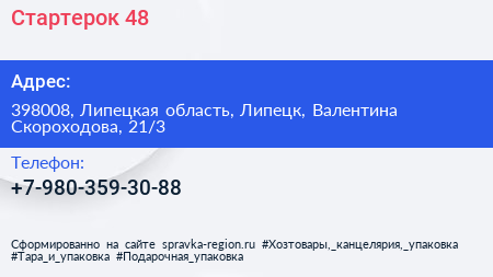 Стартерок-48 по адресу 398008, Липецкая область, Липецк, Валентина Скороходова, 21/3 в дальнейшем Организация, размещена в следующих категориях: